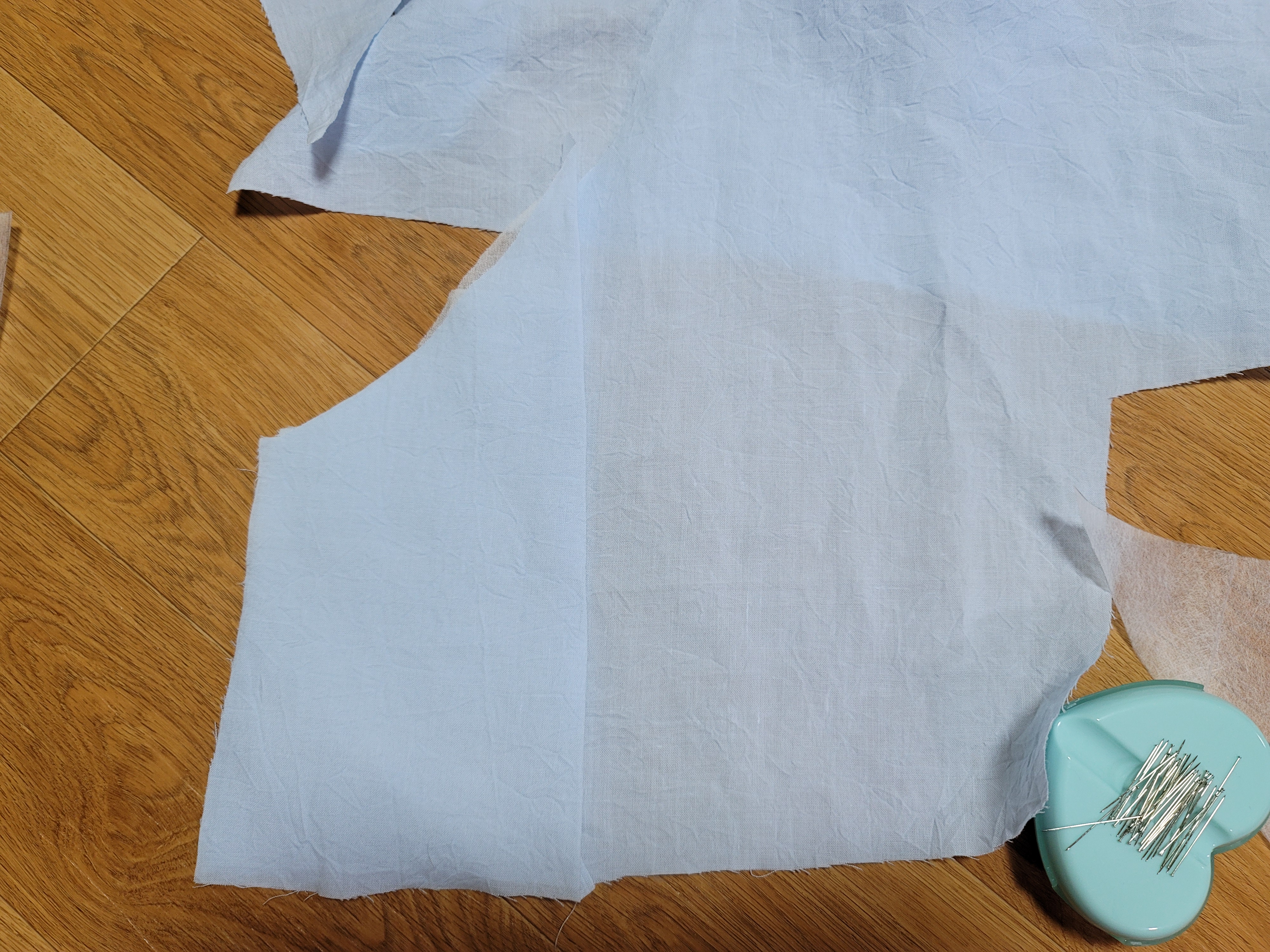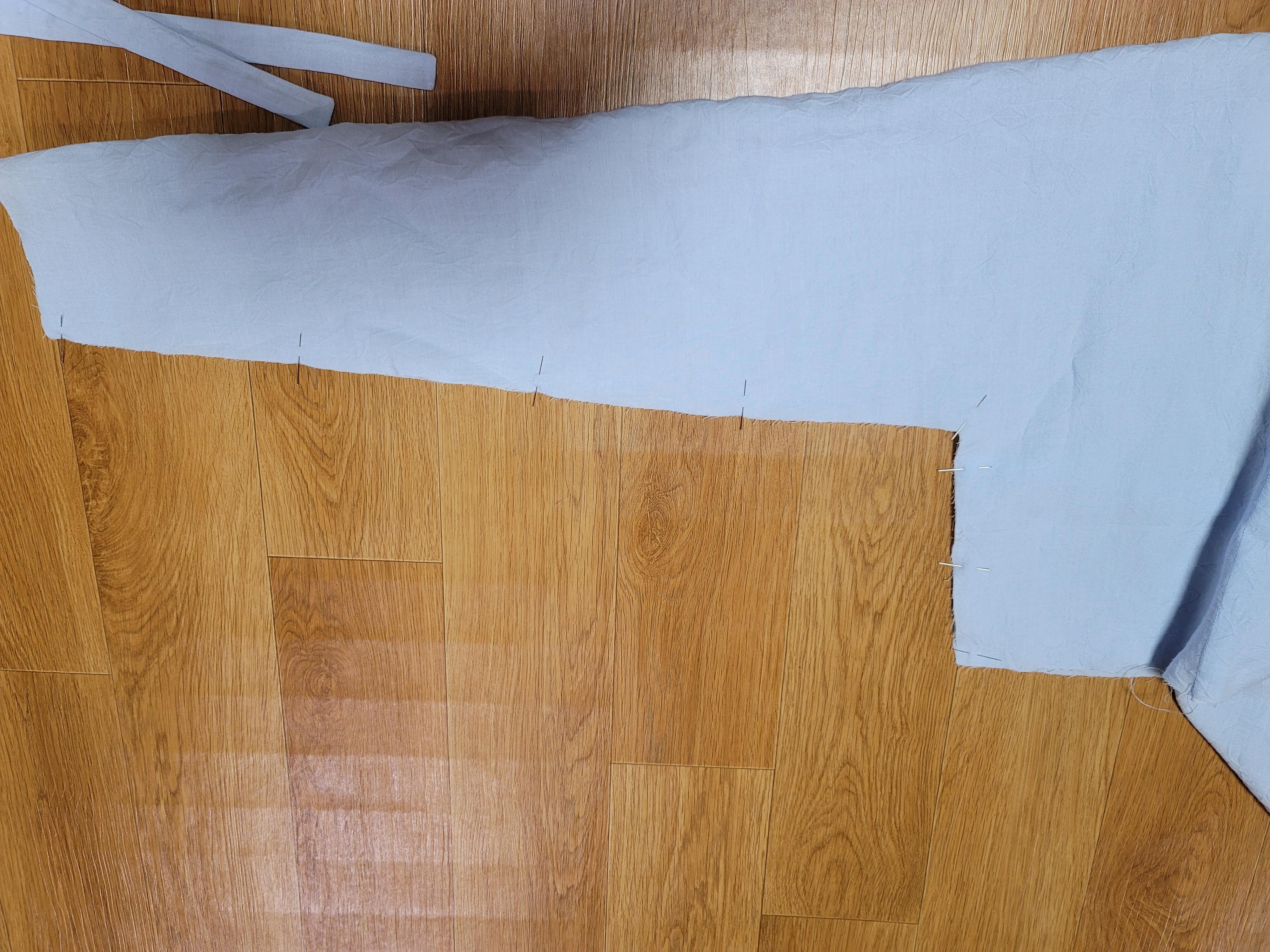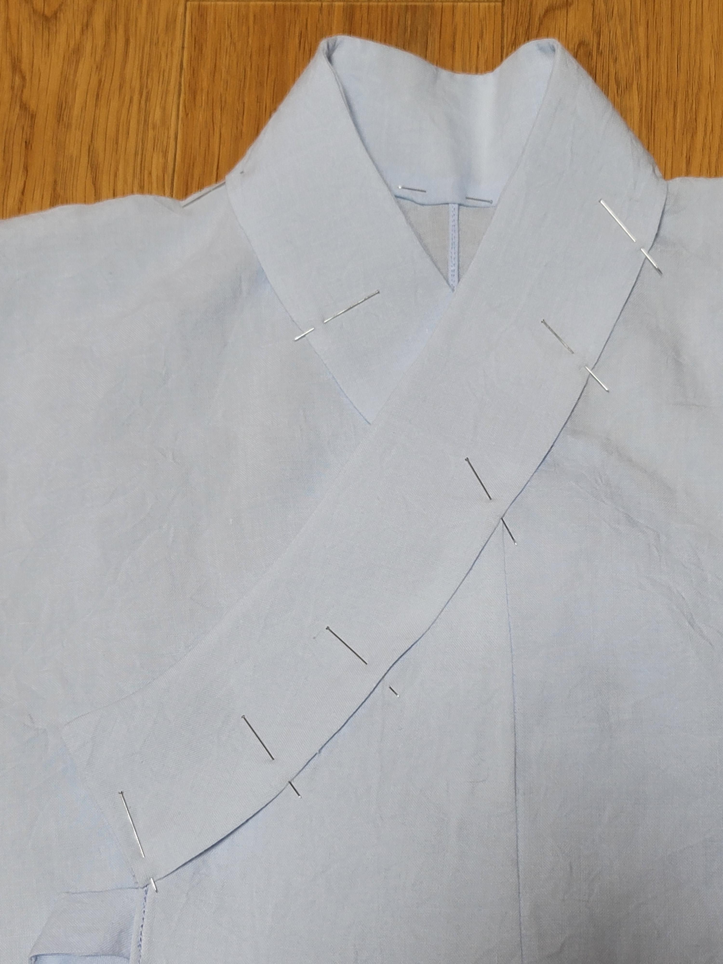 몸판에 깃을 끼워 시침핀으로 고정