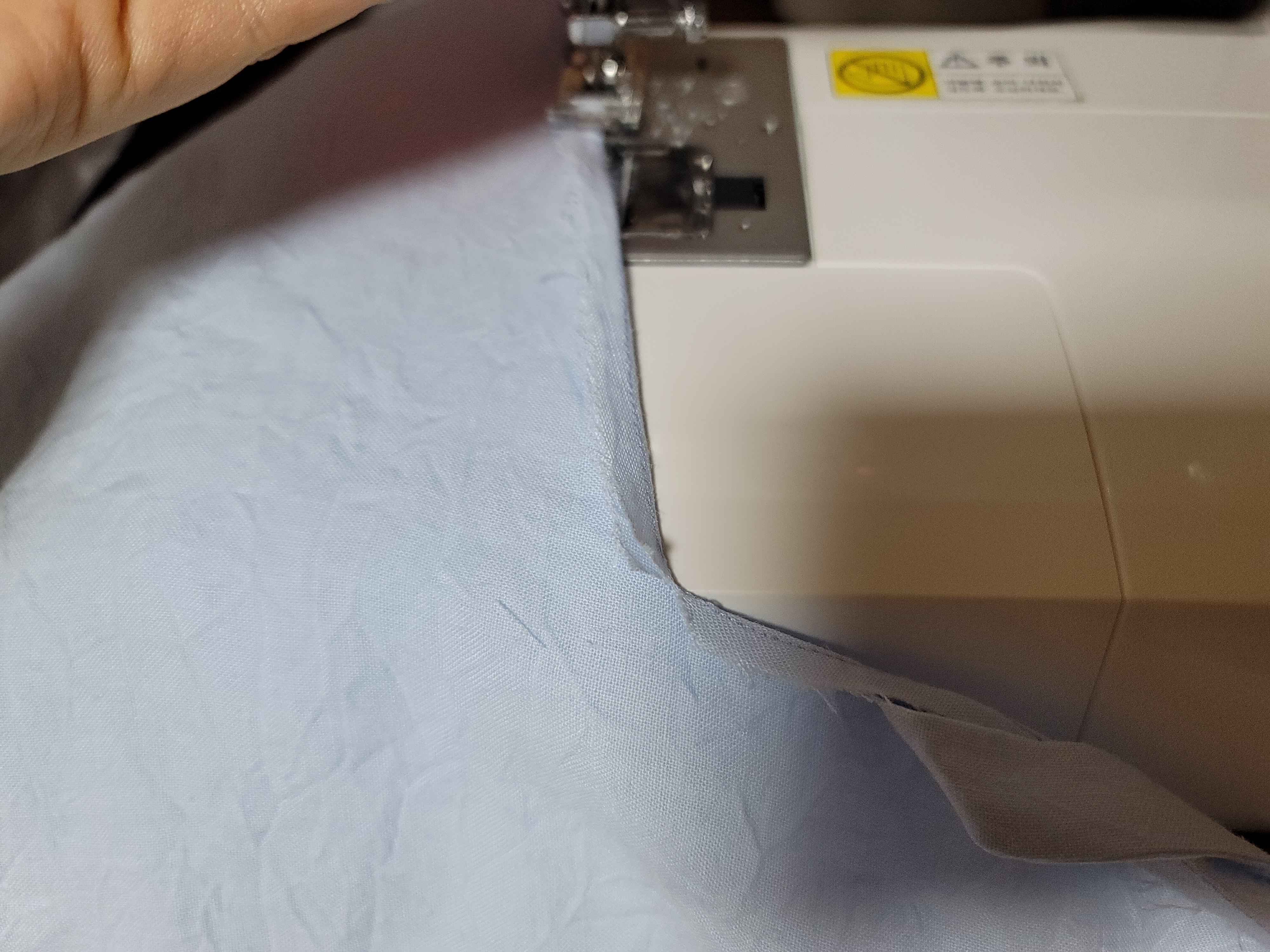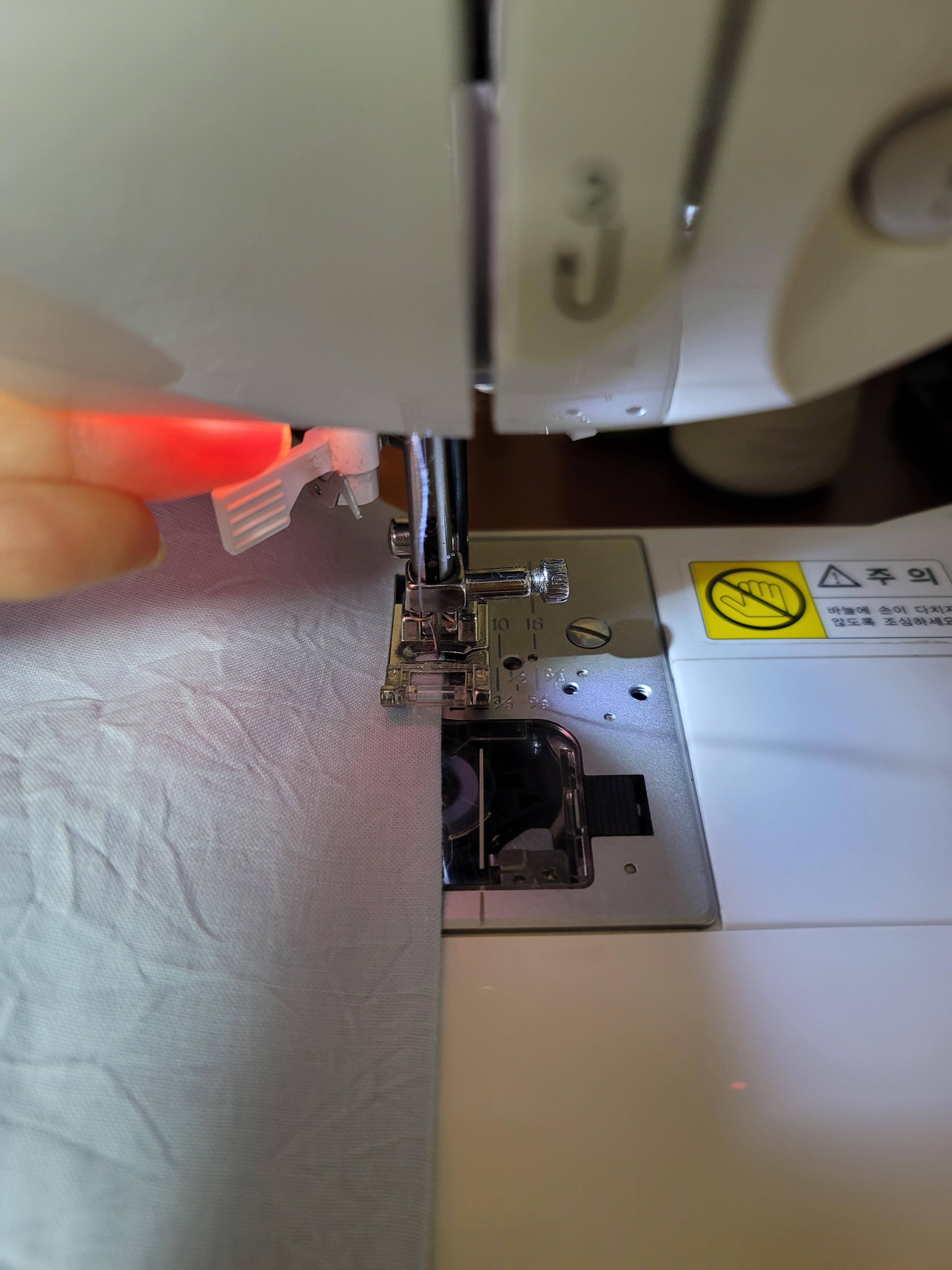 접힌 부분이 보이지 않게 뒤집는 이유는 굴곡때문에 노루발이 흔들리기 때문이에요. 이렇게 박으면 일정하게 직선 박음질이 됩니다.